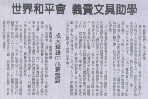 這項義賣活動事實上去年十一月便已展開,直到最近經費上的缺口還將近五十萬多,所有工作人員及社工都很擔心今年將無法順利撥付助學金給需要協助的孩子;和平會台南區分會長陳怡表示,受景氣的影響,認養孩子的助學金一直出現缺口,期待大家可以藉由捐款或購買實用的木製文具,協助籌措孩子的上學費用,幫助危機家庭的孩子,也不要忘了給熱情的義賣志工們打氣鼓勵,愛心捐款專線二一五O五七五,劃撥帳號 19964921社團法人世界和平會。