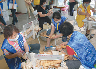 為了儘快讓愛心粽送到各個角落,和平會及新都心協會動員了30餘名志工及社區愛心媽媽,從前天起,大家分工洗米、炒料、包粽,希望趕快包完,分送給清寒、單親、隔代教養家庭及獨居老人。
