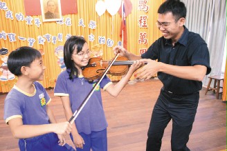 「樂興之時管弦樂團」首席演奏家吳建鋒(右)引導內海國小學童體驗他價值百萬元的小提琴,發出聲音的一剎那,學童露出驚喜笑容。記者潘欣中/攝影 古典樂下鄉 百萬小提琴當教具 聯合報/2008.09.17/潘欣中/大園 「哇,太好聽了,再來一首!」大園鄉內國小師生昨天大飽耳福,3名多次在國家音樂廳表演的「樂興之時管弦樂」年輕團員,應世界和平會之邀到內海國小表演,藉由輕鬆的解說,讓這群位處偏鄉的學童也感受到經典名曲的音樂魅力。 「樂興之時管弦樂團」前年成立「台灣大哥大音樂大使」,在全省巡迴演出,世界和平會希望偏鄉學校的孩子,也能接觸到國家音樂廳才聽得到的古典音樂表演,昨天安排音樂大使到內海國小;「這些孩子首次聆賞高水準的現場音樂表演,樂不可支,感覺距離不再是那麼的遙遠。」校長葉春櫻說。 3名下鄉表演的年輕團員吳建鋒、林亦宜、劉穎文都是樂團首席演奏家,在演奏卡農、G弦之歌等動人的古典作品之外,還演奏孩子喜歡的卡通影片神隱少女、電影動畫片風中奇緣等多首膾炙人口歌曲。孩童驚訝說,還以為小提琴只能奏出古典歌曲,演奏現代歌曲一樣動人。 25歲的吳建鋒主修小提琴,他利用演奏的空檔,以淺顯易懂的解說,讓孩子了解古典和經典名曲的由來,他還用自己價值百萬元的小提琴當教具,引導孩子體驗小提琴;他笑說,行前有做「功課」,希望藉由解說互動的音樂講堂形式,讓精緻藝術深入社會各角落,為偏遠地區的孩子帶來音樂、歡樂與愛。 |