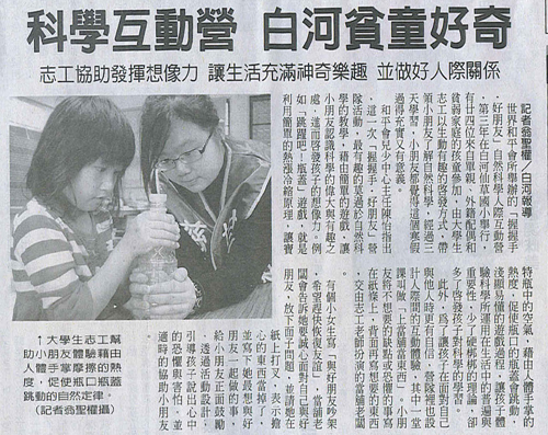 世界和平會所舉辦的「握握手‧好朋友」自然科學人際互動營,第三年在白河仙草國小舉行,有廿四位來自單親、外籍配偶和貧弱家庭的孩童參加,由大學生志工以生動有趣的啟發方式,帶領小朋友了解自然科學,經過三天學習,小朋友都覺得這個寒假過得有充實又有意義。