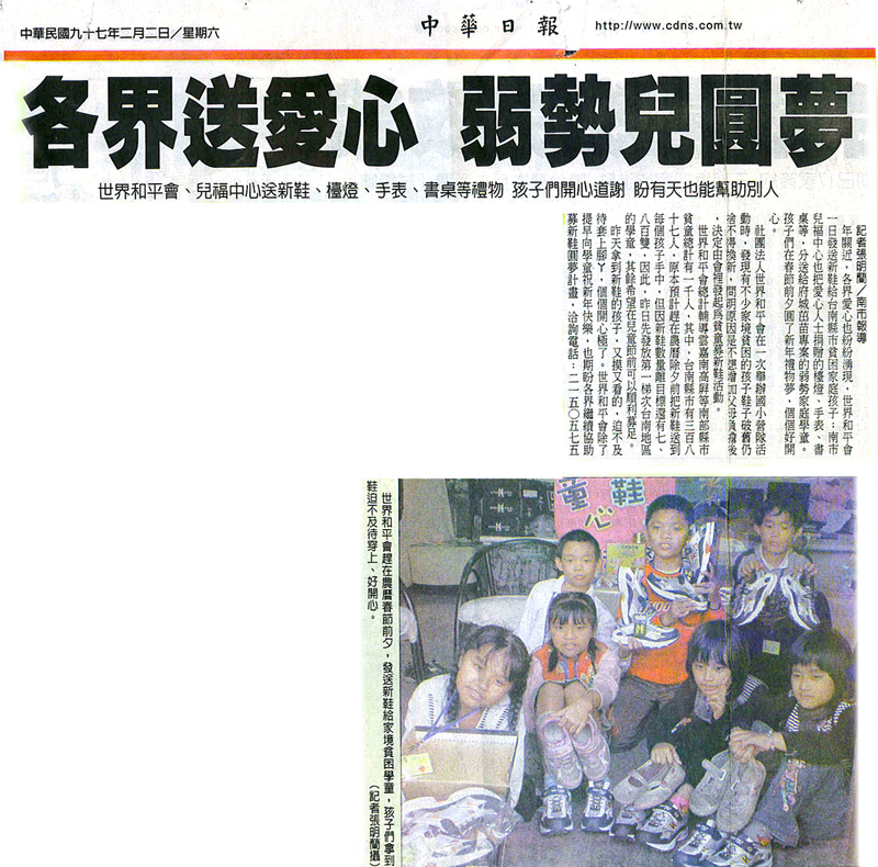 世界和平會總計輔導雲嘉南高屏等南部縣市貧童總計有一千人,其中,台南縣市有三百八十七人,原本預計趕在農曆除夕前把新鞋送到每個孩子手中,但因新鞋數量離目標還有七、八百雙,因此,昨日先發放第一梯次台南地區的學童,其餘希望在兒童節前可以順利募足。