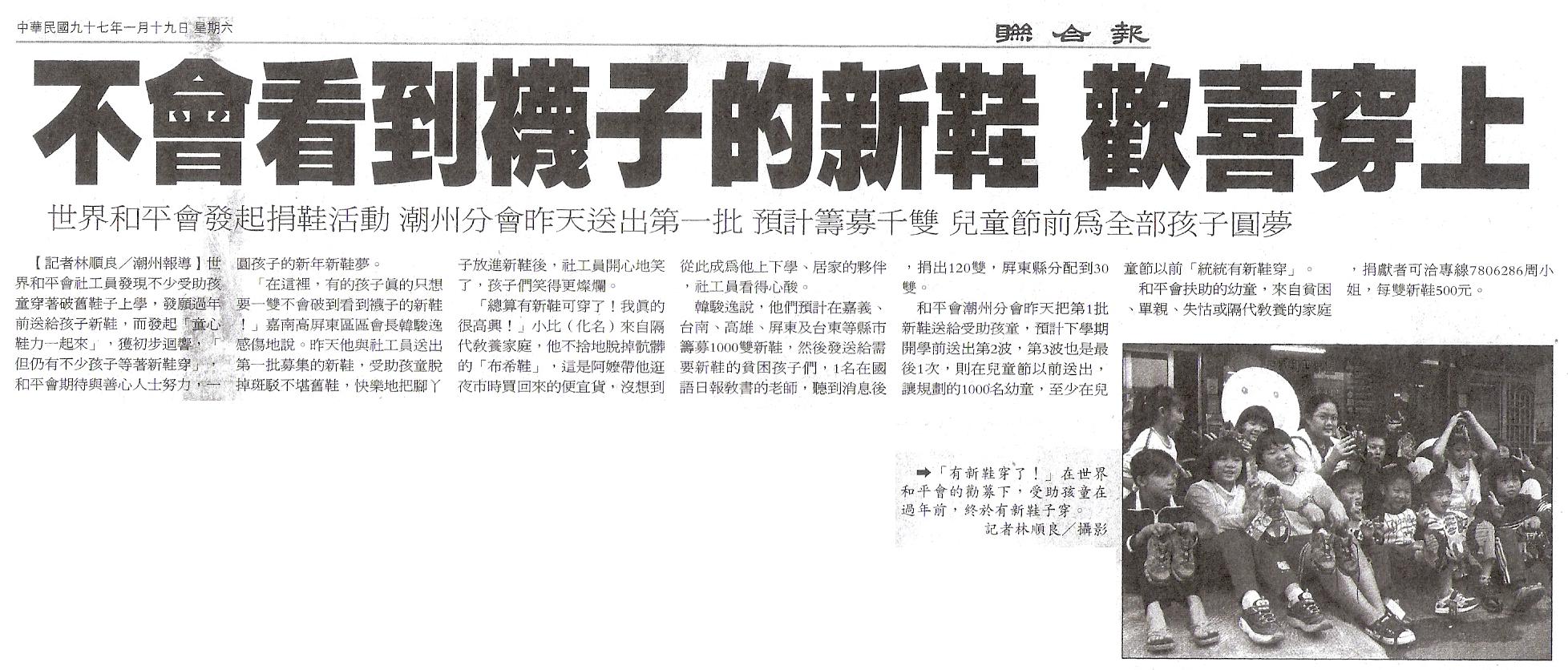 和平會潮州分會昨天把第1批新鞋送給受助孩童,預計下學期開學前送出第2波,第3波也是最後1次,則在兒童節以前送出,讓規劃的1000名幼童,至少在兒童節以前「統統有新鞋穿」。