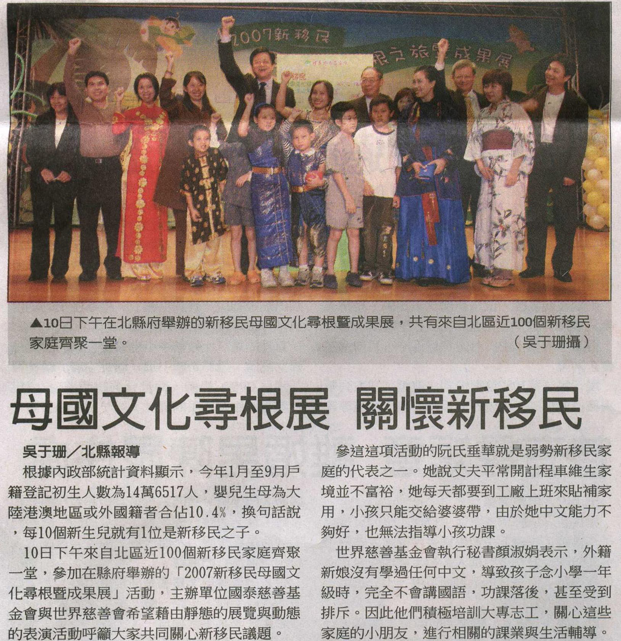 10日下午來自北區近100個新移民家庭齊聚一堂,參加在縣府舉辦的「2007新移民母國文化尋根暨成果展」活動,主辦單位國泰慈善基金會與世界慈善會希望藉由靜態的展覽與動態的表演活動呼籲大家共同關心新移民議題。