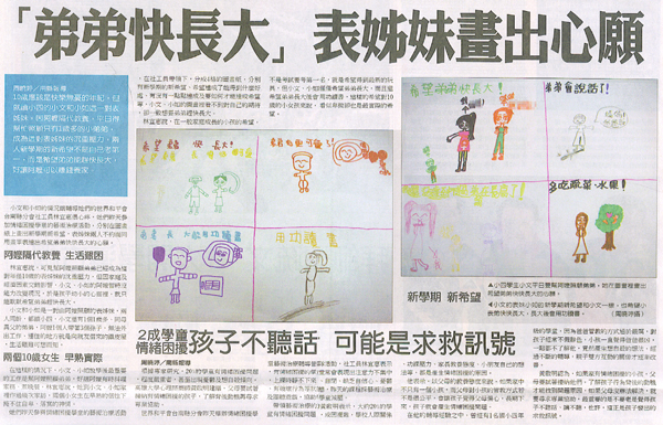 她們昨天參與情緒困擾學童的藝術治療活動,在社工員帶領下,分成4格的圖畫紙,分別有新學期的新希望、希望達成了能得到什麼好處、有沒有一點點達成及要如何才能達成希望等,小文、小如的圖畫裡看不到對自己的期待,卻一致想要弟弟趕快長大。