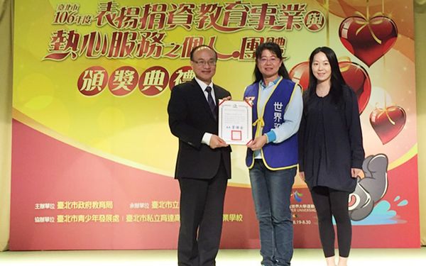 台北市106年度表揚捐資教育事業與熱心服務之個人團體頒獎典禮,由接受本會長期服務愛心早餐的學校-台北市五常國小推薦,受台北市政府教育局肯定,並由教育局局長曾燦金頒贈榮譽狀,感謝本會長期對弱勢兒童餐食營養的關心與付出,幫助孩童健健康康長大。