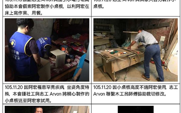 新竹縣社工員 賴怡秀 本會助養孩童阿宏(化名),領有肢障中度手冊,下半身無力癱軟,隨著年齡的增長,加上無法自主運動,體重也直線增加,其雙手亦無力支撐自己的身體,生活起居全都要倚靠他人協助。在家的活動空間就是一張雙人床,但因無適用的小桌板,阿宏必須請家人將一塊板子放置大腿上,阿宏再彎身趴在板子上寫作業。本會社工家訪觀察此事後轉知有水電、木工資源的志工Arvon,並請其協助客製小桌板供阿宏使用。Arvon隨即邀集親友一起動手製作小桌板,但因材料限制不易組裝,又因阿宏長期坐姿不良,小桌板高度無法準確預估,其客製過程花費不少心力。在阿宏收到適用的小桌板後,開心的不得了,而這群志工們的努力更為動人。 感謝Arvon邀集加引水電行老闆、木工-呂師傅等親友為本會的服務推動盡心盡力,幫助阿宏擁有專屬小桌板,可以坐姿端正的寫功課、吃飯,減輕他身體承受的辛苦。 服務照片如下: