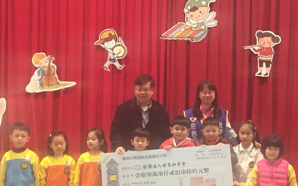 桃園市莊敬國小響應搶救受飢兒愛心罐活動,募集愛心早餐經費177,279元,校長陳裕豐於歲末感恩歡樂會中頒贈支票,也感謝世界和平會長期對於莊敬國小的服務協助。