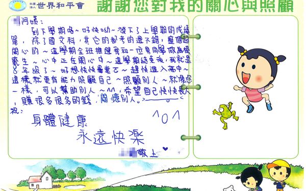 世界和平會每學期發送助學金、生活用品與食品物資給服務的家庭;孩子們也寫卡片,感謝幫助他們的叔叔、阿姨們。